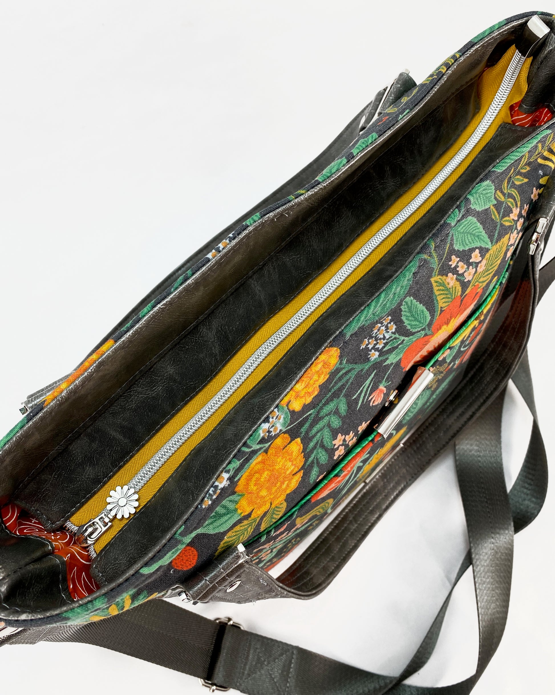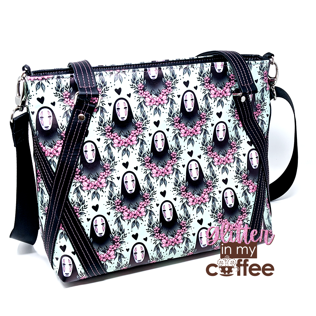 The Passion Flower tote is a medium sized tote with a zippered closure and strap accents on the exterior. The pattern can be made with either shoulder length straps or shorter handles. It also has a crossbody strap which can be omitted if you are making the shoulder straps.