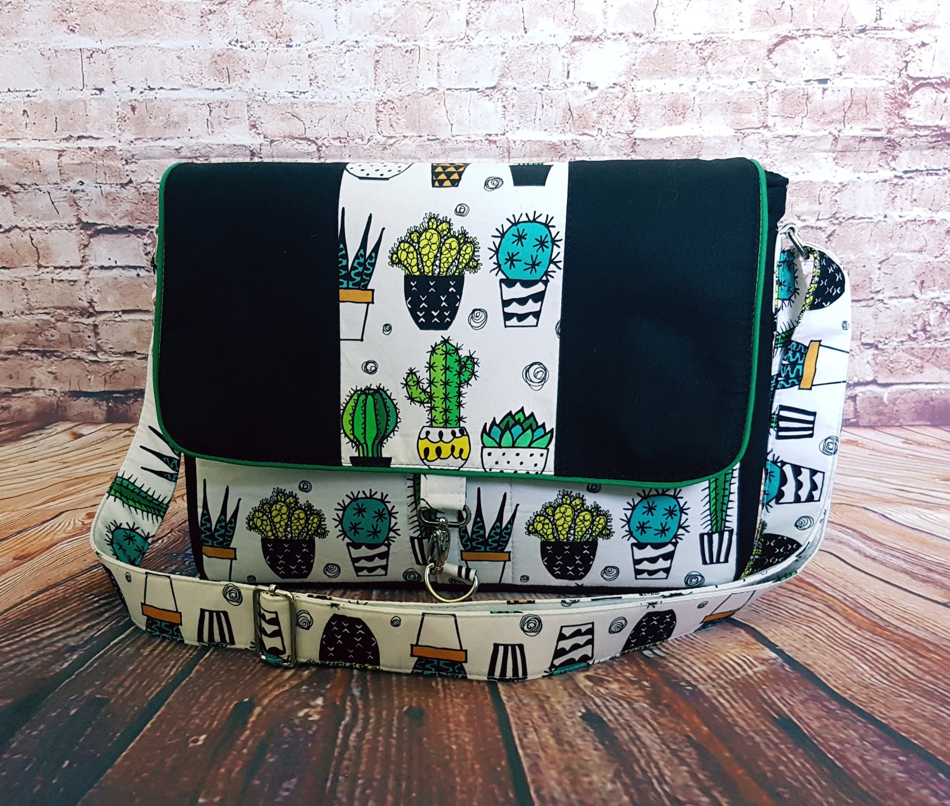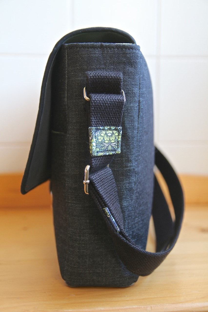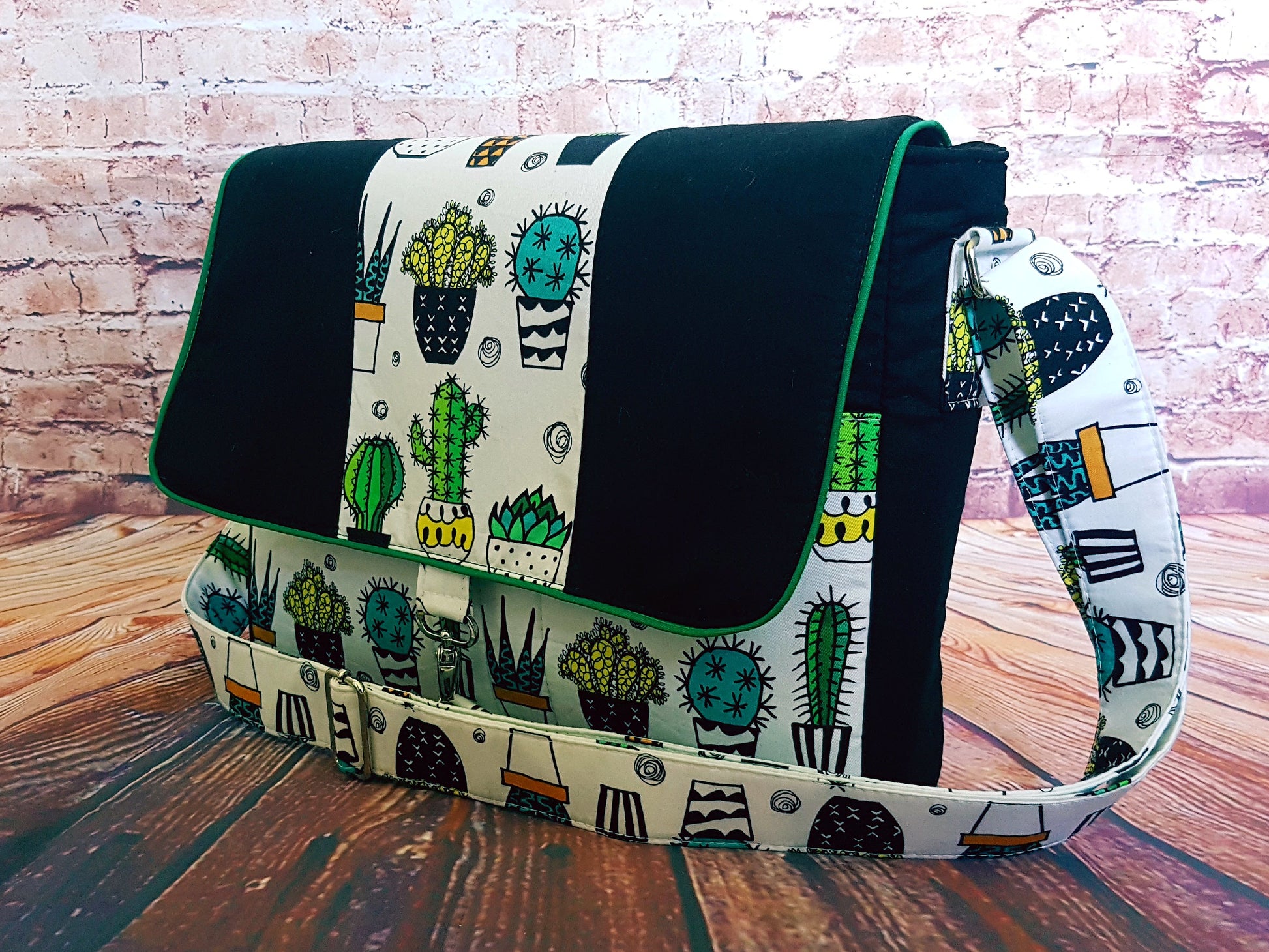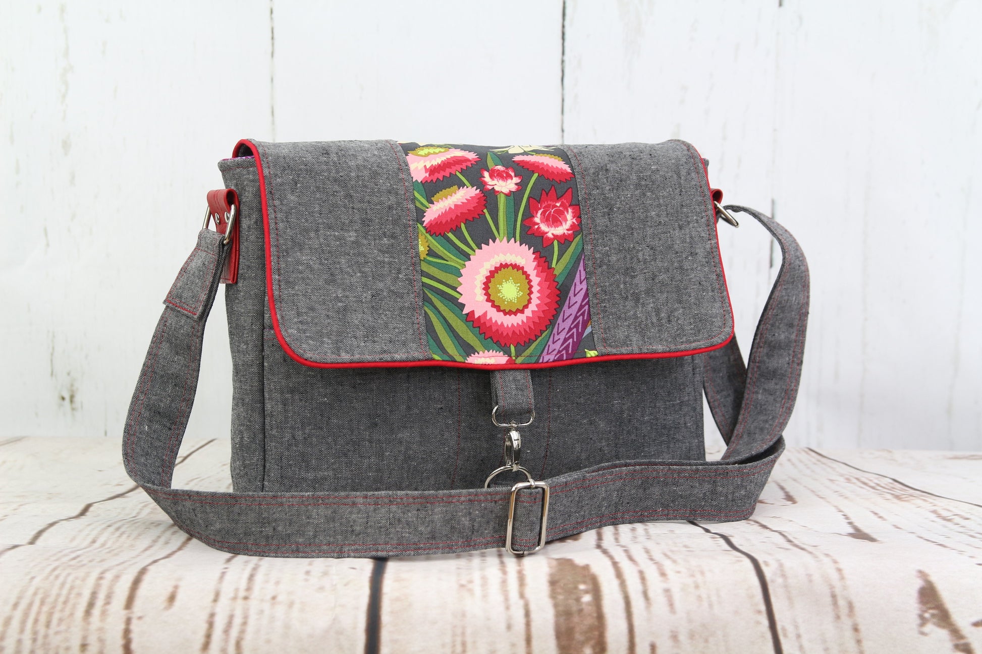 The strap is adjustable so the bag can be worn across the body or over one shoulder. I recommend making this bag in heavier fabrics such as home decor, canvas, denim, faux leather however it can be made with quilt weight cotton if desired. This is a more structured bag that uses a stiffer sew-in interfacing.