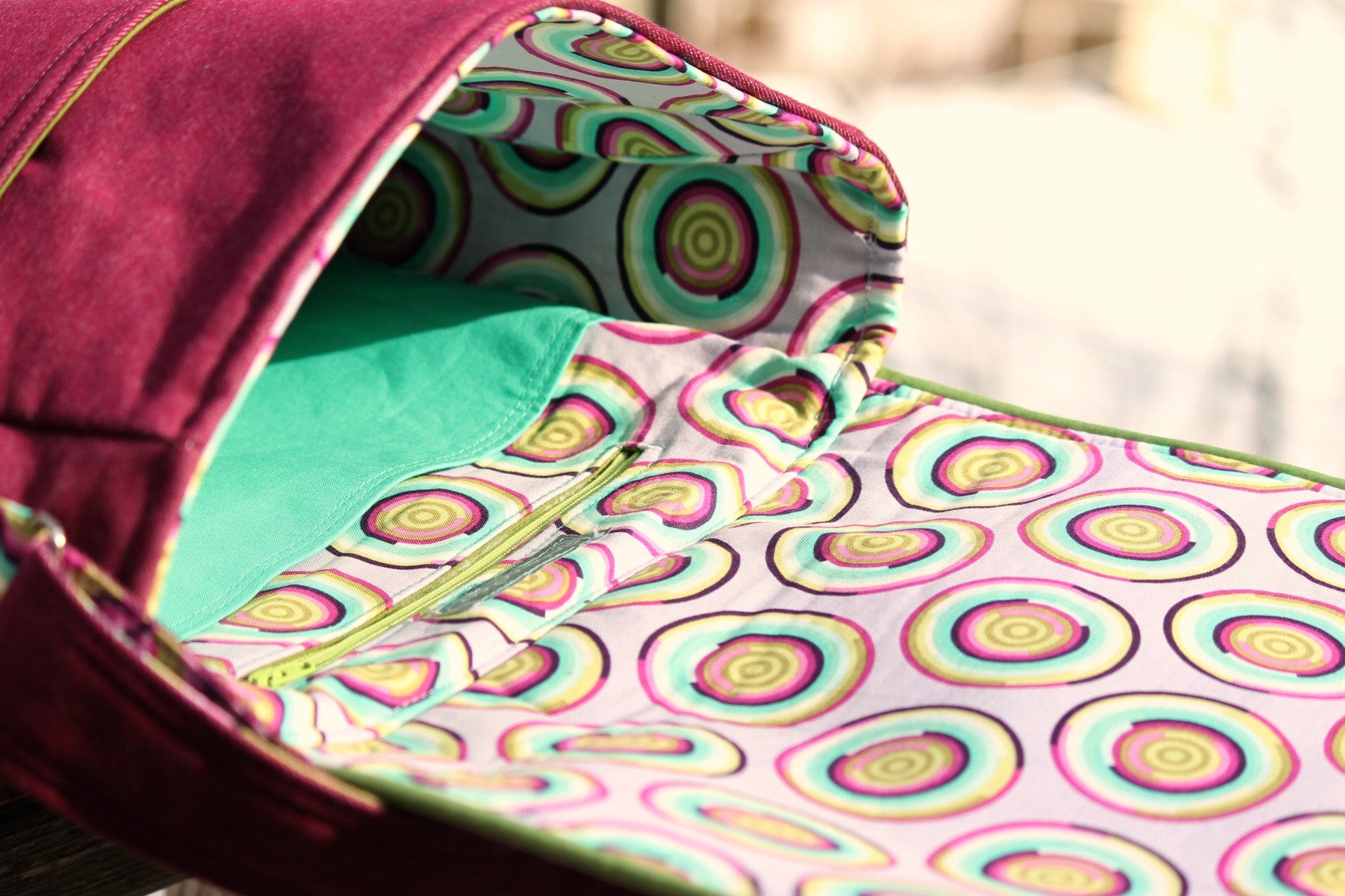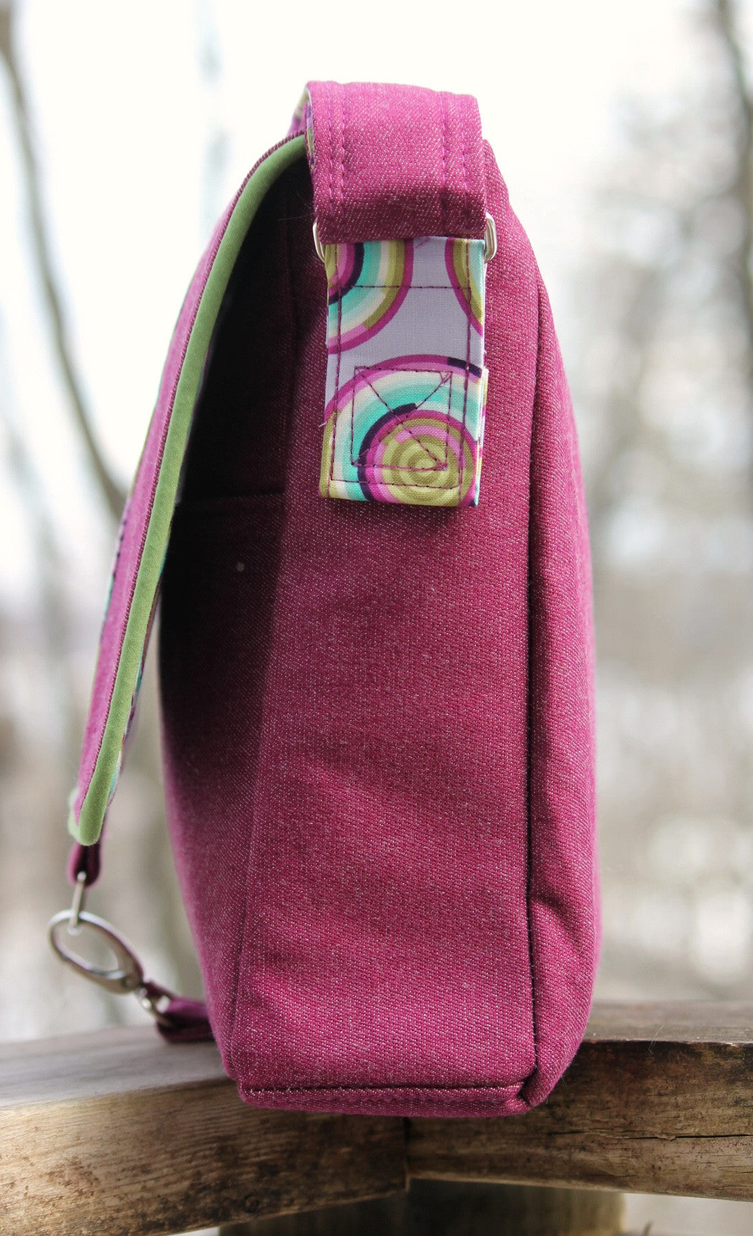This is my first pattern that uses piping as an accent around the edge of the flap. The flap has a swivel clasp closure like many of my other patterns. The pattern also includes instructions on how to sew your own adjustable strap although you are free to use webbing if you like.