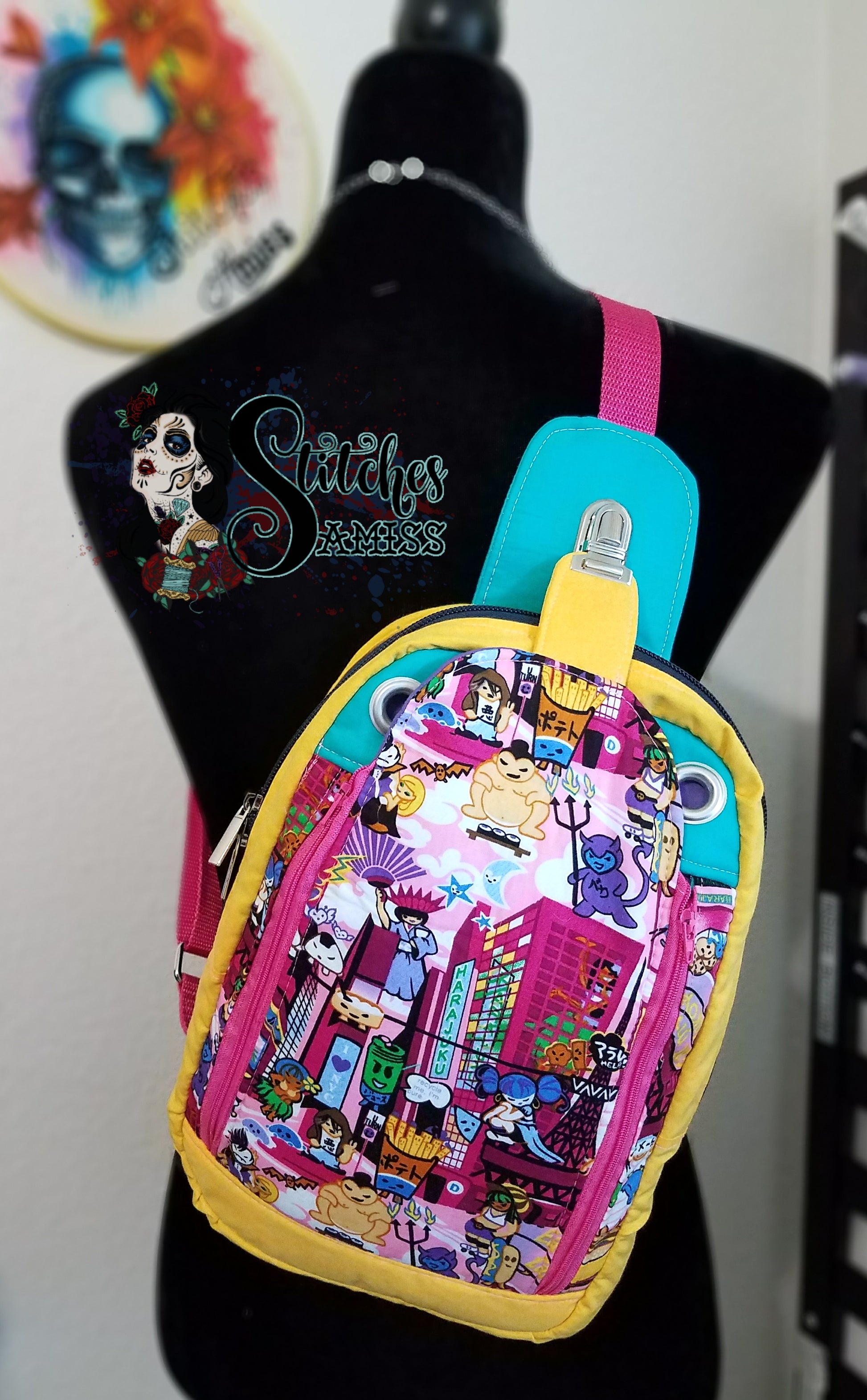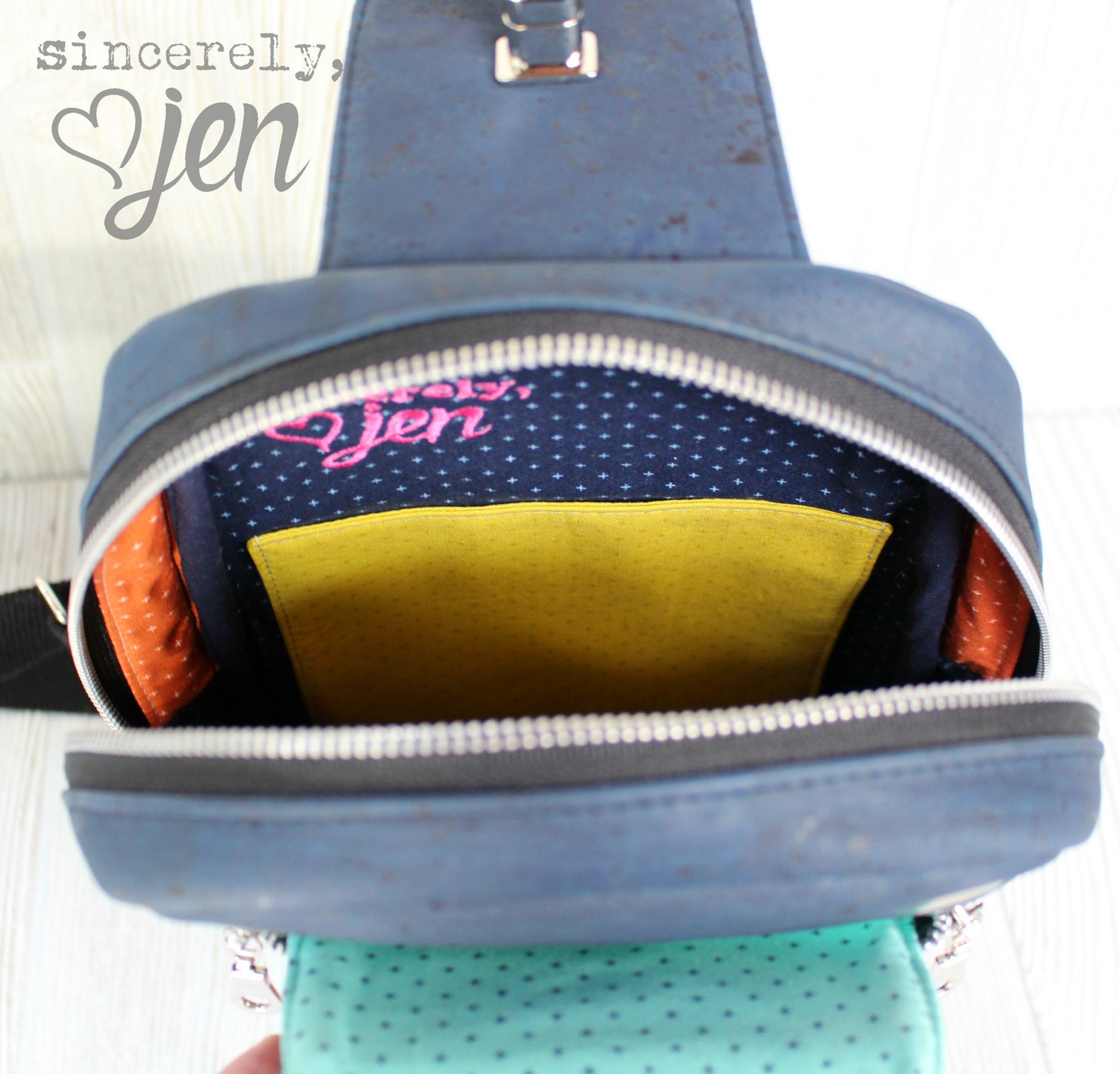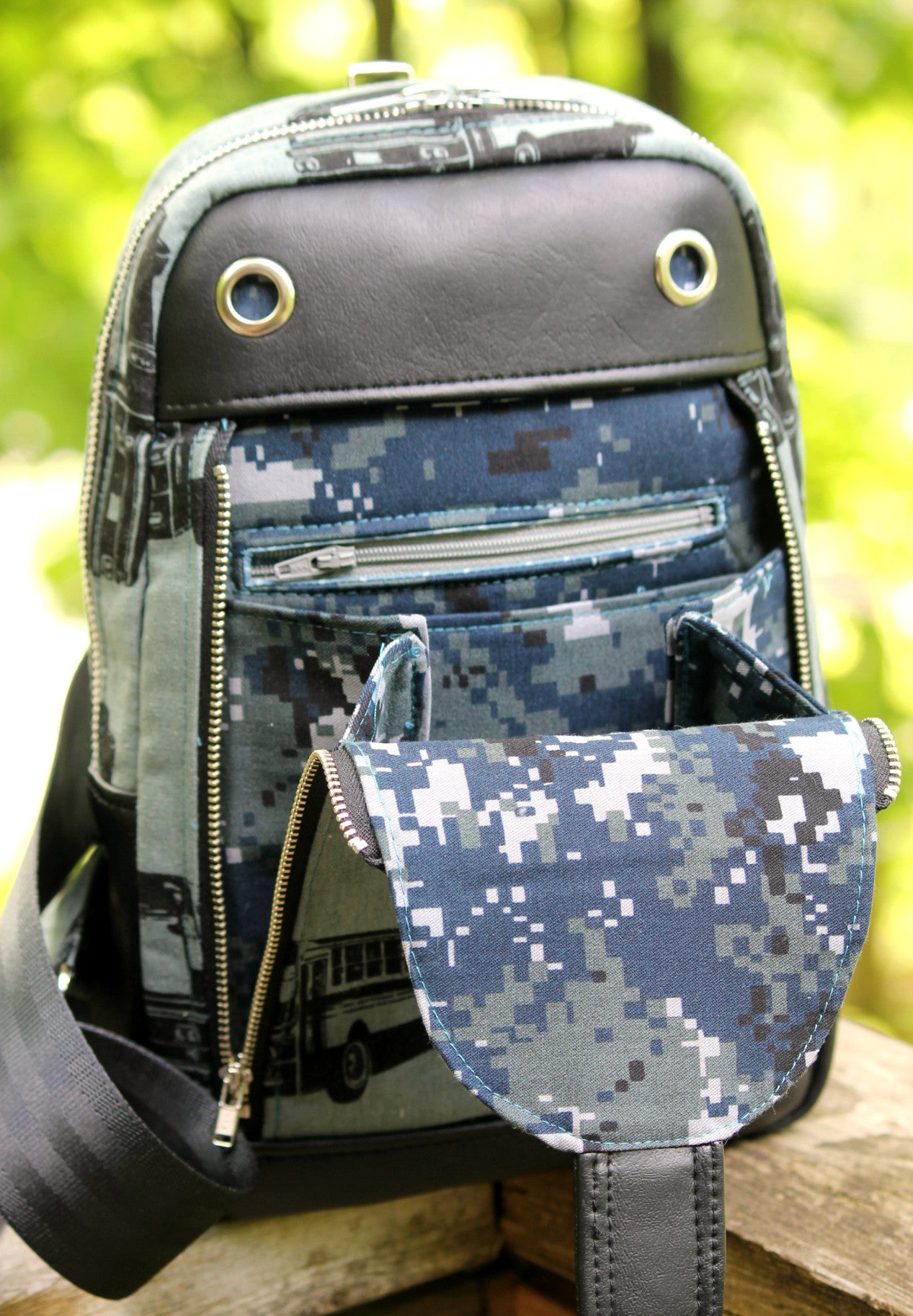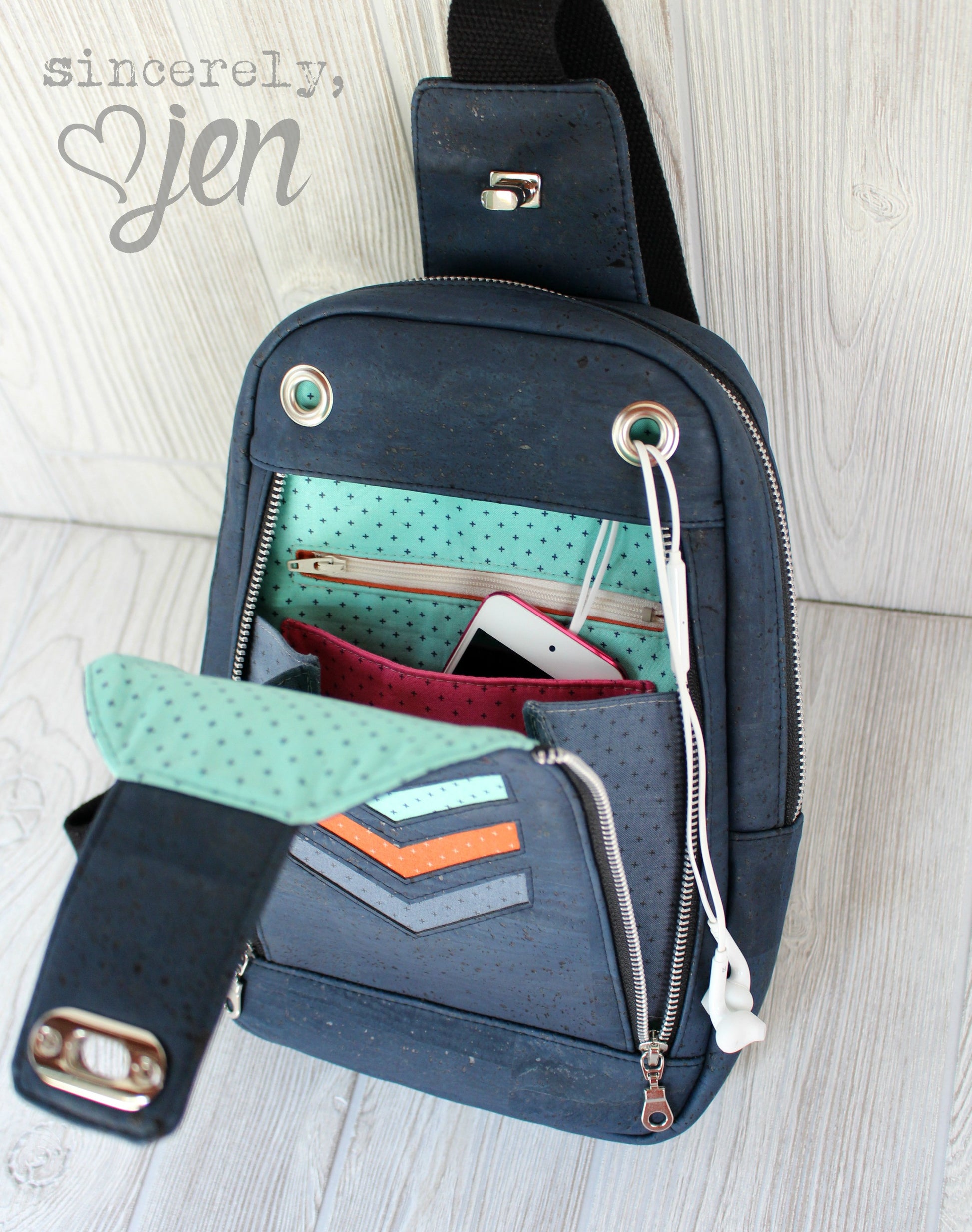 The Speedwell Sling bag is the perfect unisex bag. It has one front zippered flap pocket with 2 zippers on each side and closes at the top with your choice of a small thumb lock, turn lock or magnetic snap. When the flap is fully open, the contents will remain inside this front pocket thanks to the gussets on both sides. Inside this front flap pocket are 1 slip pocket and 1 zippered pocket. You may also wish to install one or two grommets (optional) as shown in tester photos in the top band, just above the front flap pocket. These grommets are to allow your ear bud wires when your phone is stored in the front flap pocket.