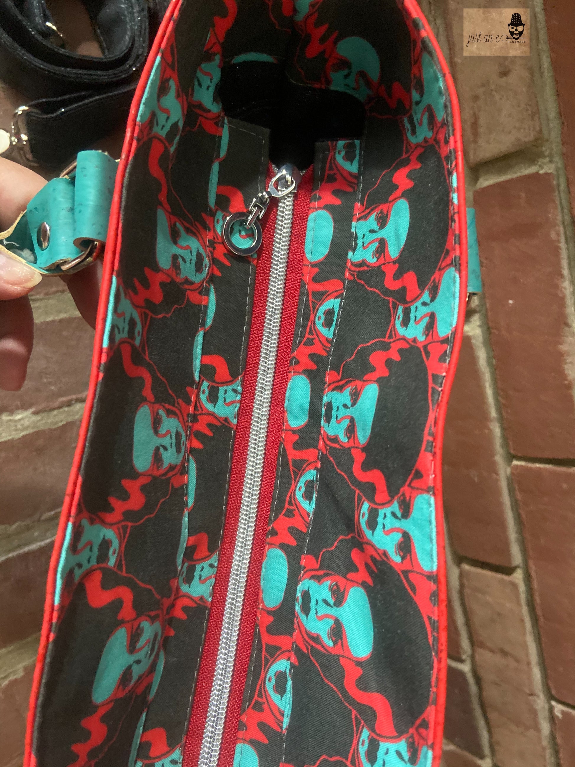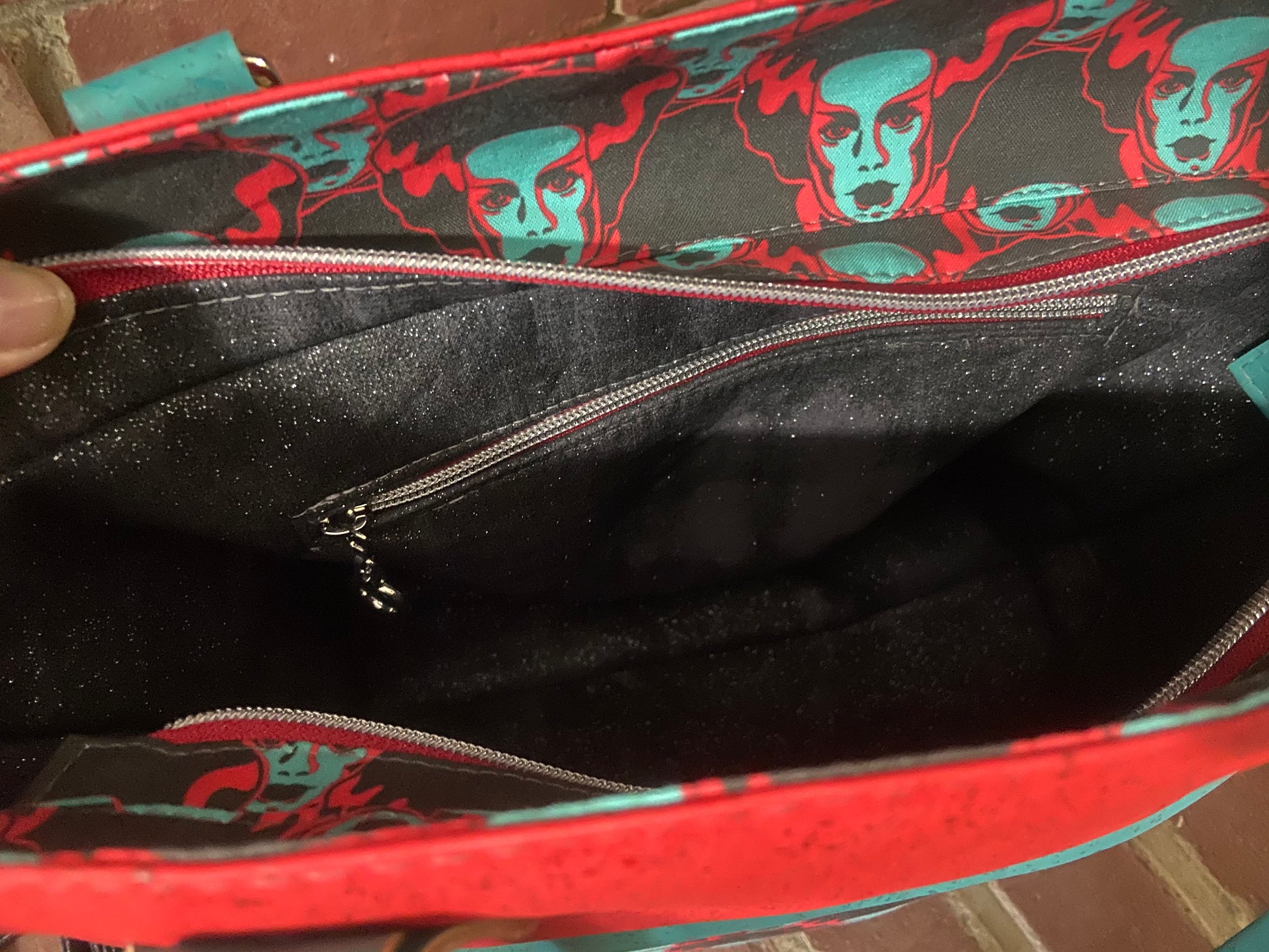 The interior of the bag has a zippered main closure, one interior zippered pocket and 3 interior slip pockets.