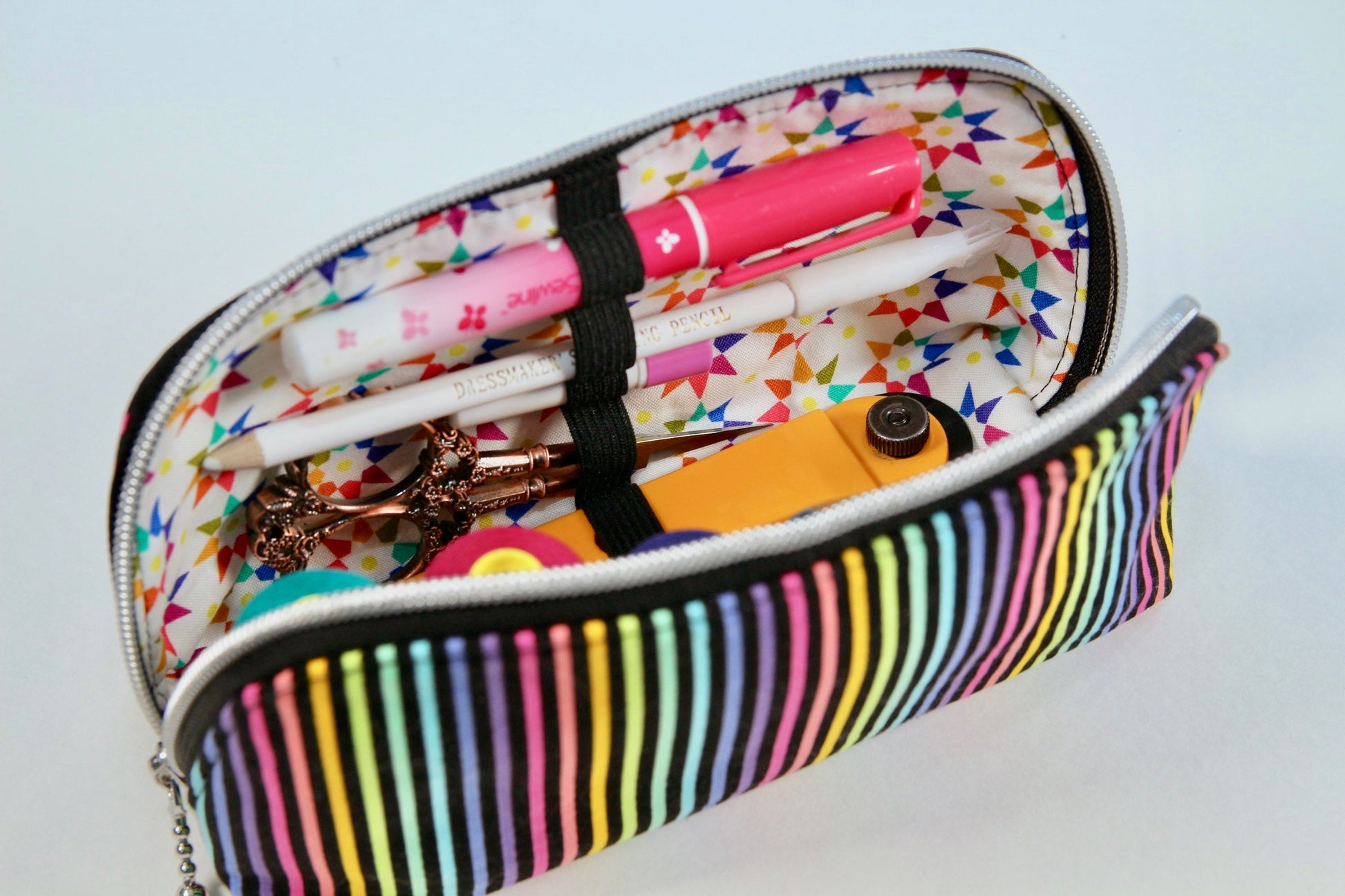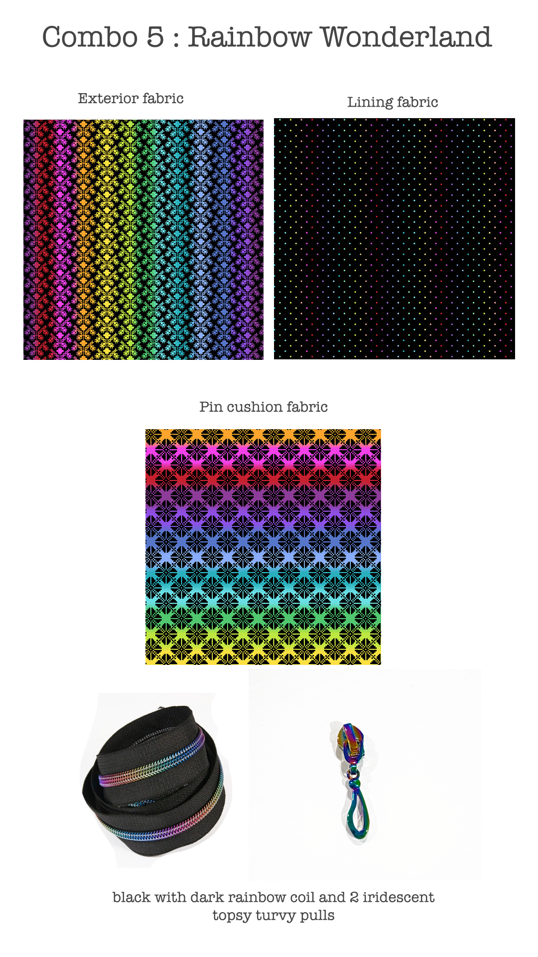 - all materials required to make one small Crocus sewing kit including exterior fabric, lining fabric, pin cushion fabric, fusible woven interfacing, fusible fleece, double pull zipper and elastic. I've also included one metal "handmade" label to each kit.