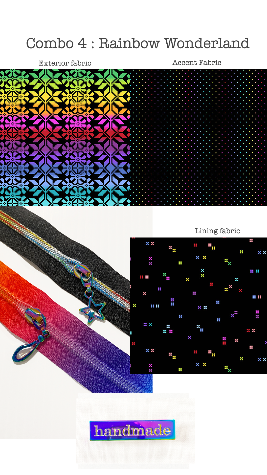 - all materials required to make one Petunia Pleated Pouch including exterior fabric, lining fabric, fusible woven interfacing, fusible fleece, exterior and interior zippers as well as one metal label with the word "Handmade" engraved.