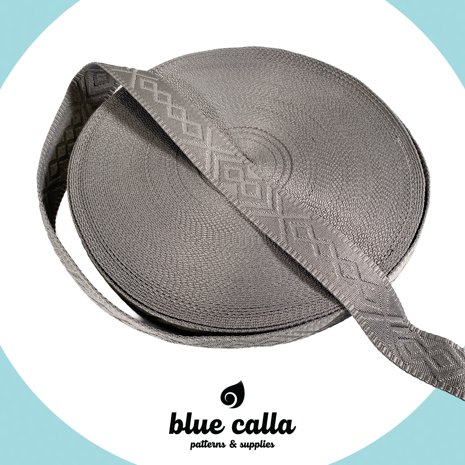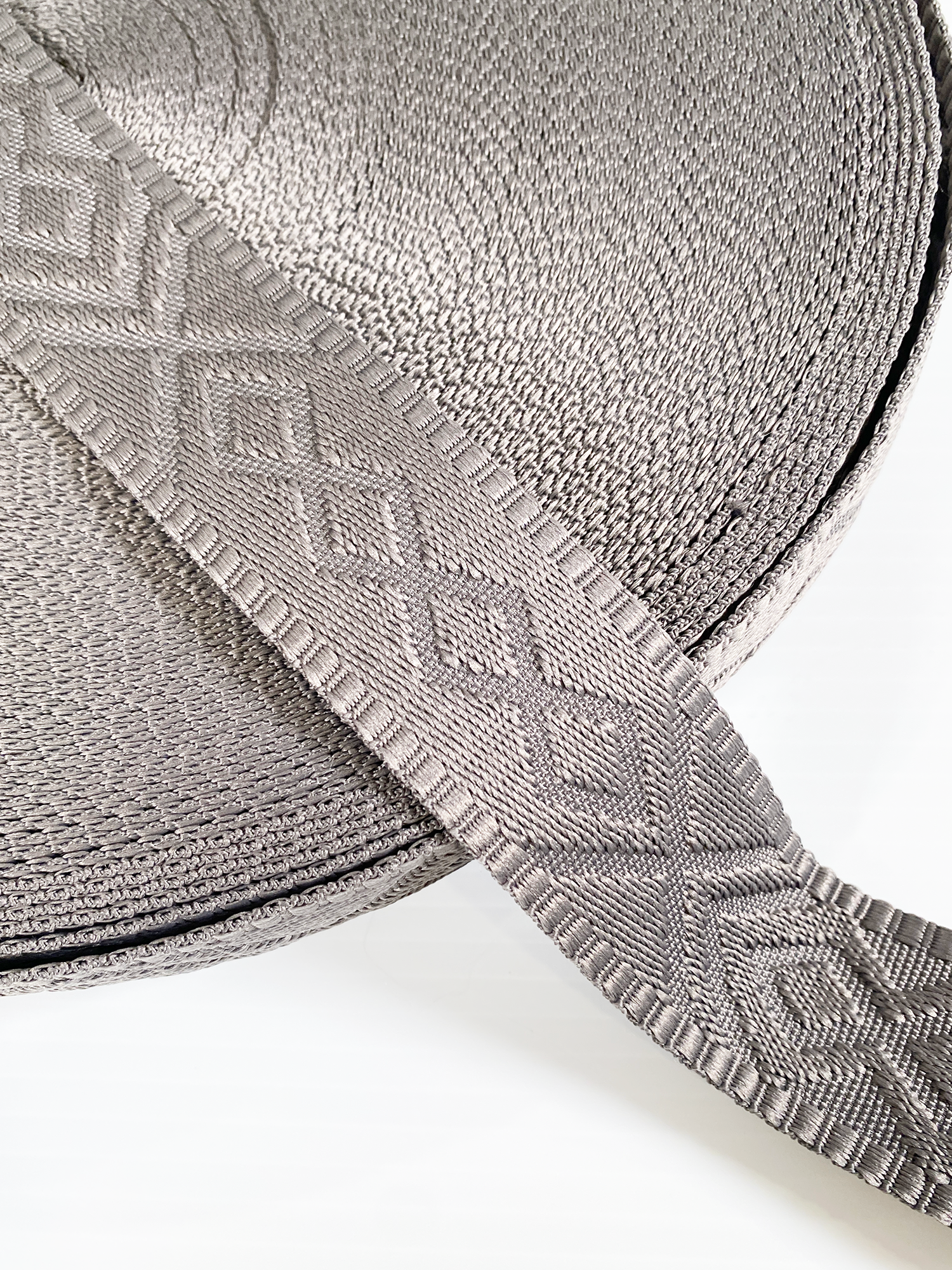 100% Polyester jacquard webbing in a knit pattern. The strap is identical on both sides.