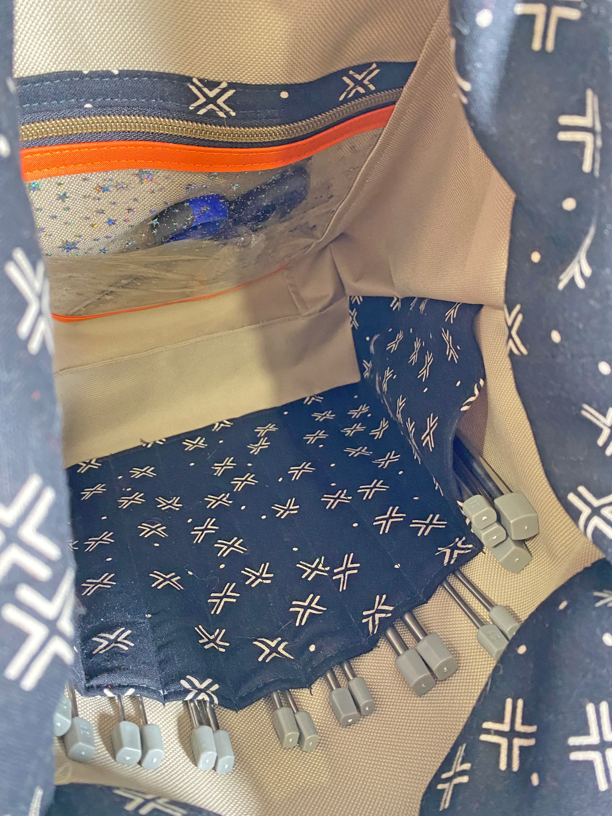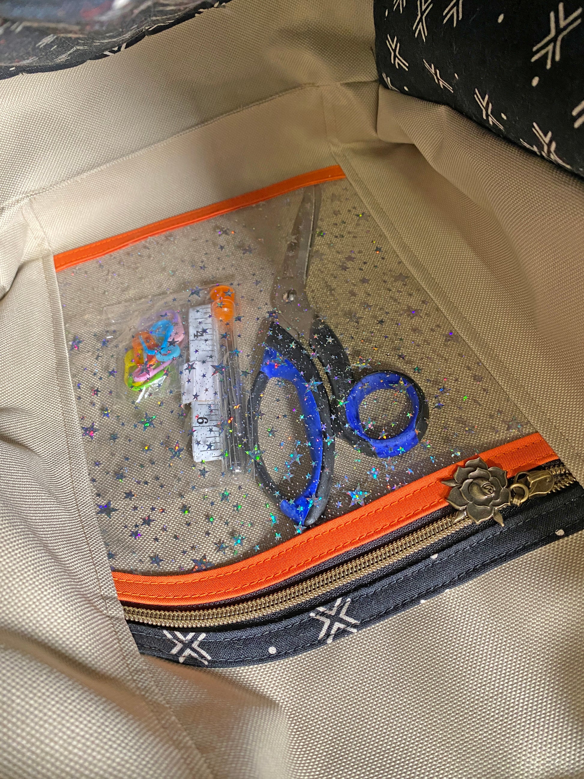 The main lining as well as the exterior zipper pocket lining are in a beige waterproof canvas. The needle pockets are in the same linen/cotton blend as the drawstring closure and the clear vinyl used for the interior zipper pocket has pretty iridescent stars.