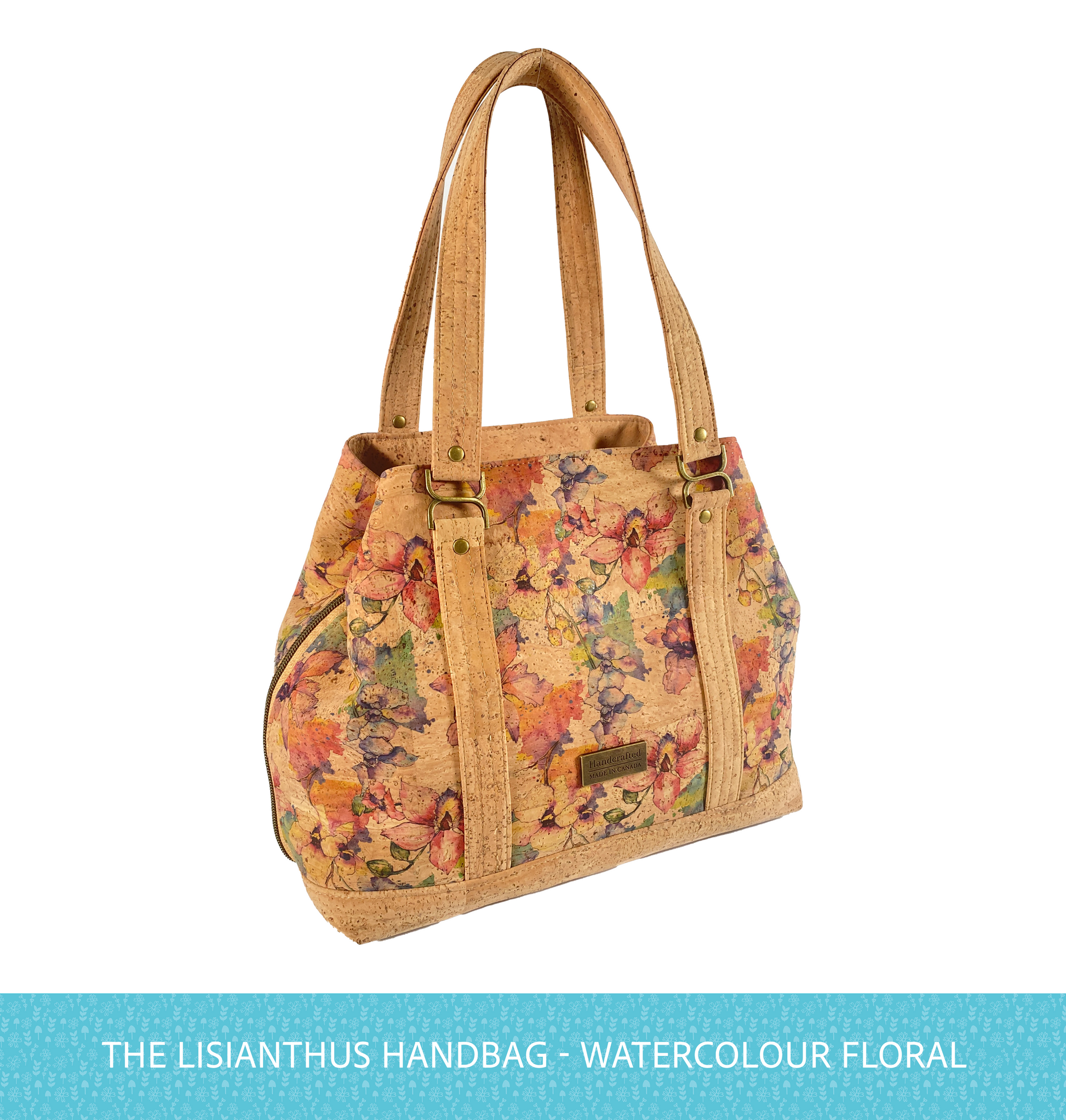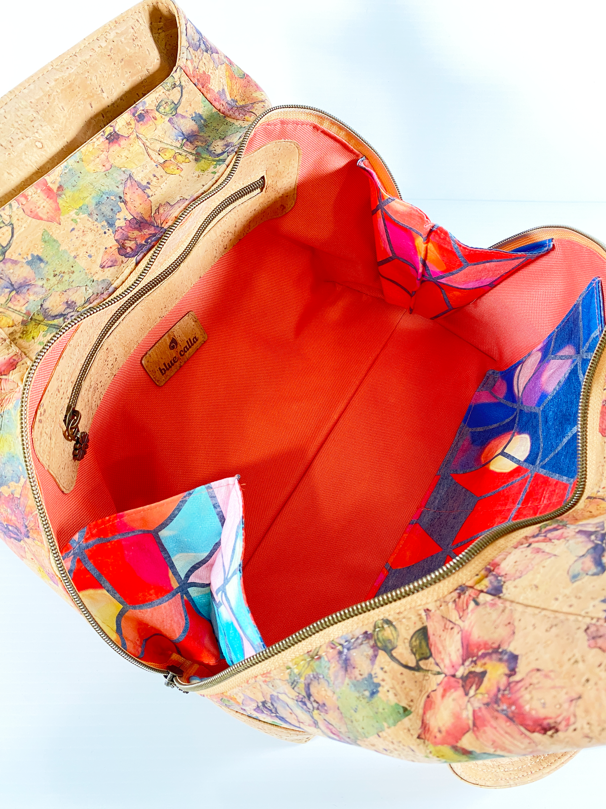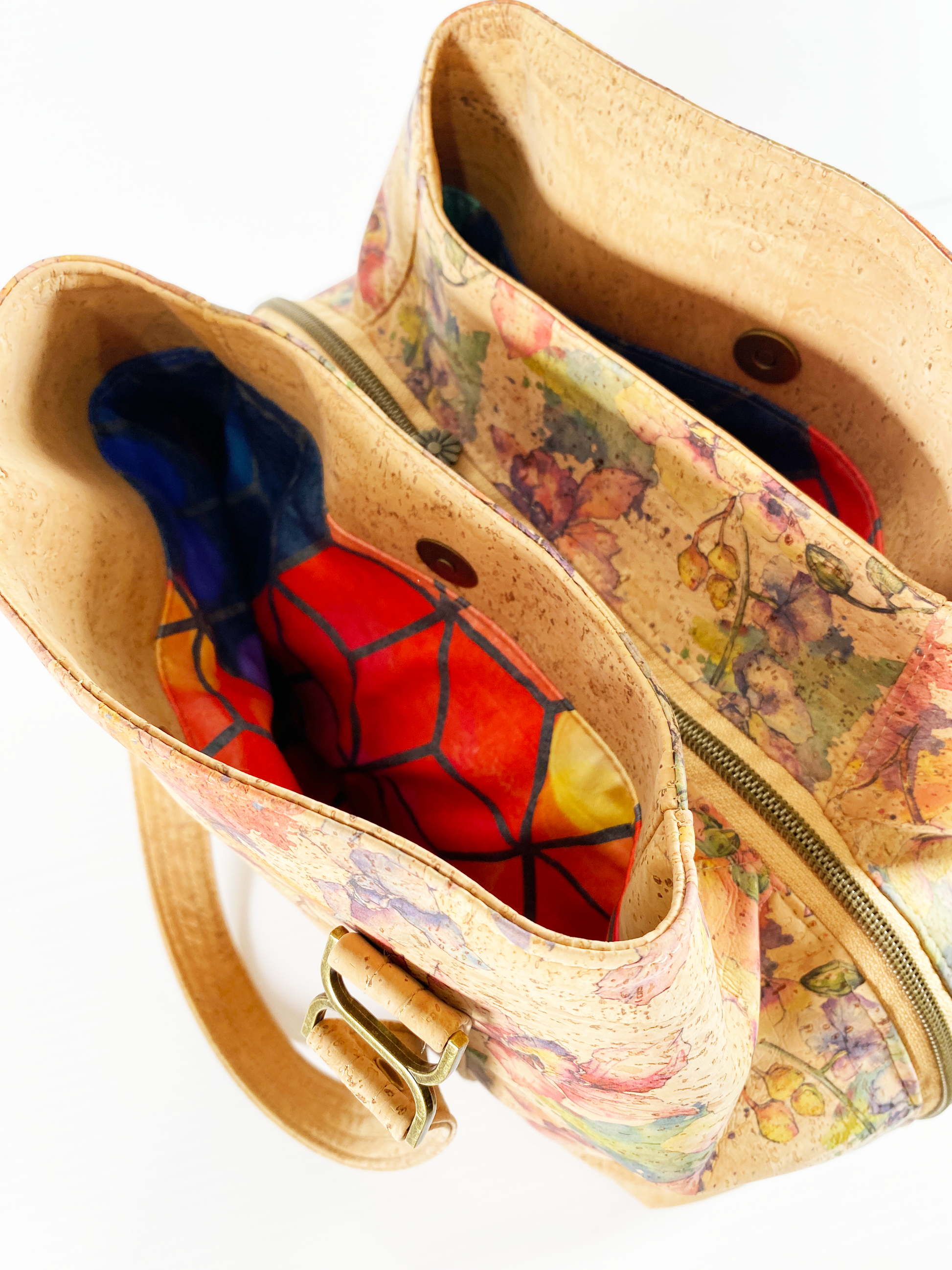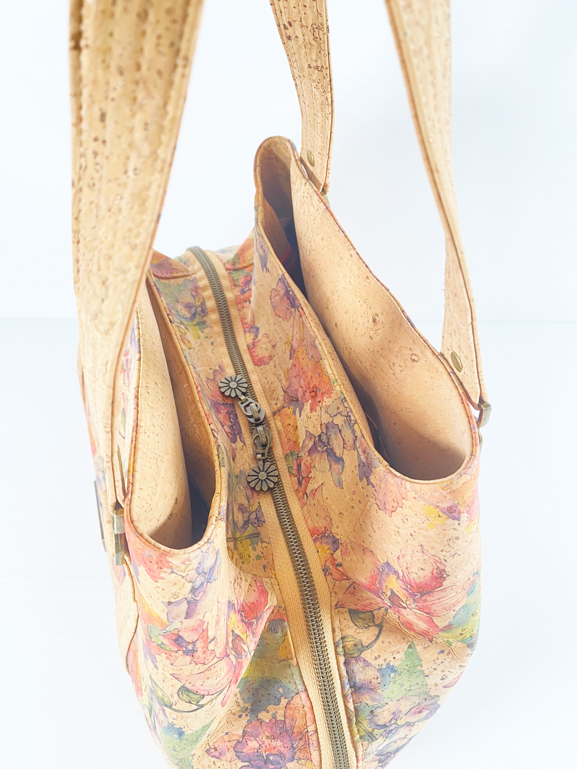 This is one of the samples made during the design process for the Lisianthus handbag. It has a full cork exterior with a combination of a watercolour floral on natural and paired with solid natural cork for the bottom and handles.