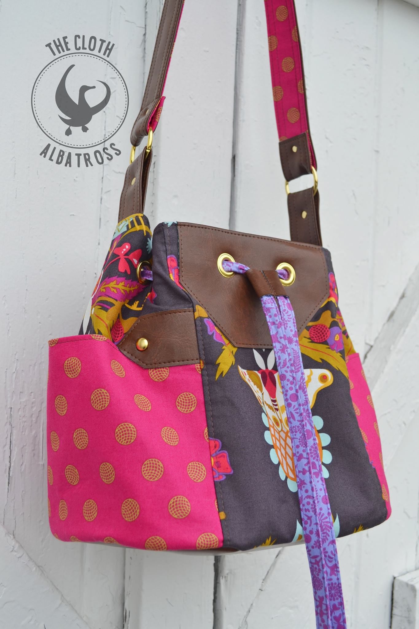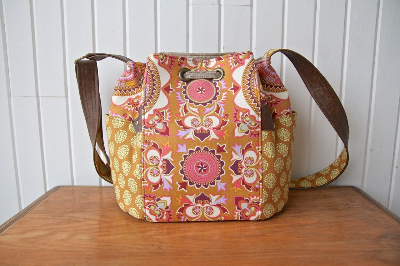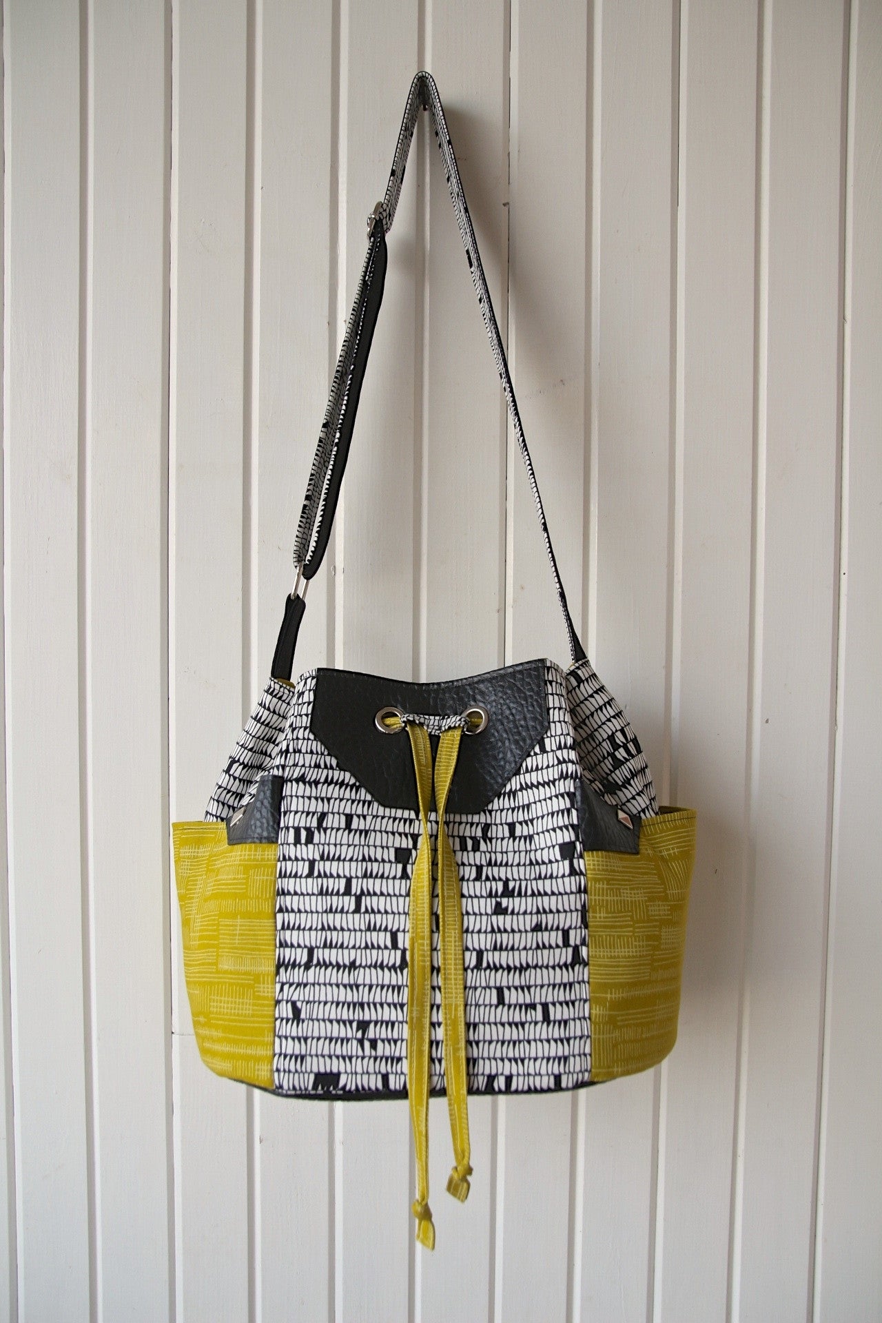 The Dahlia Drawstring Bucket bag is a trendy medium sized bag that stays closed with a drawstring closure. It has 2 exterior side pockets, 1 interior slip pocket and 1 interior zippered pocket. On the exterior, you can use quilt weight cotton or home decor fabric. There are some vinyl/faux leather accents at the side pockets, on the front of the bag, the bottom and the top side of the adjustable cross body strap.
