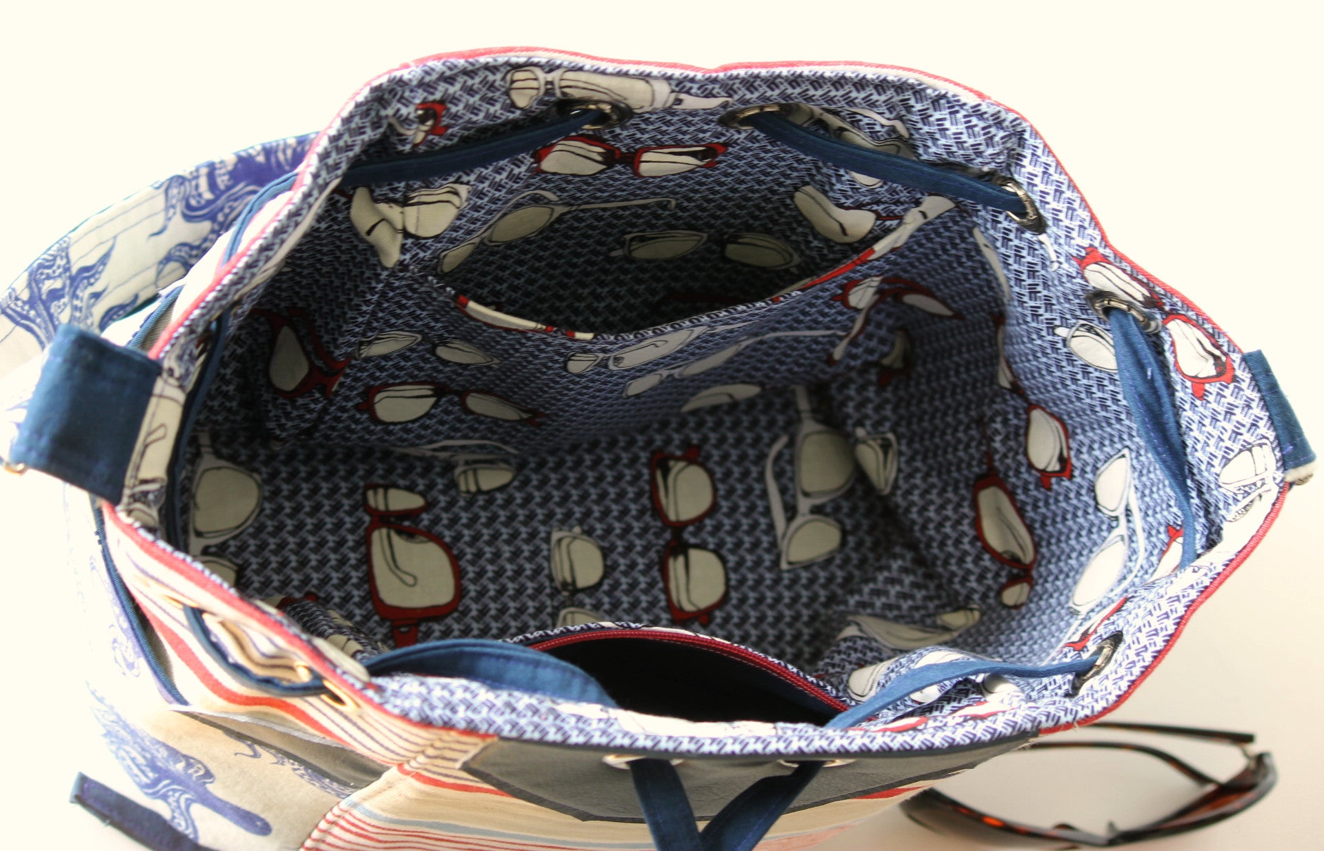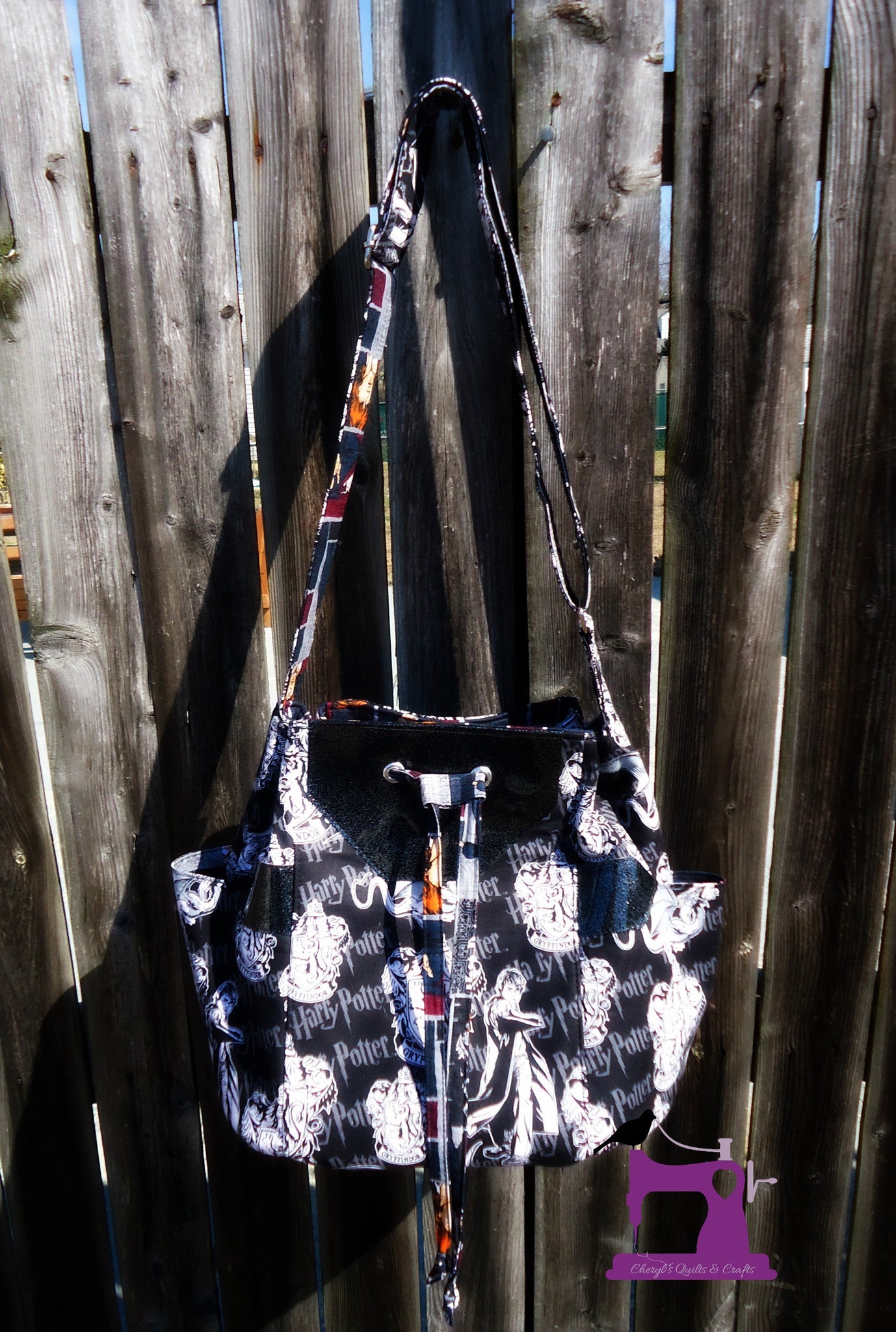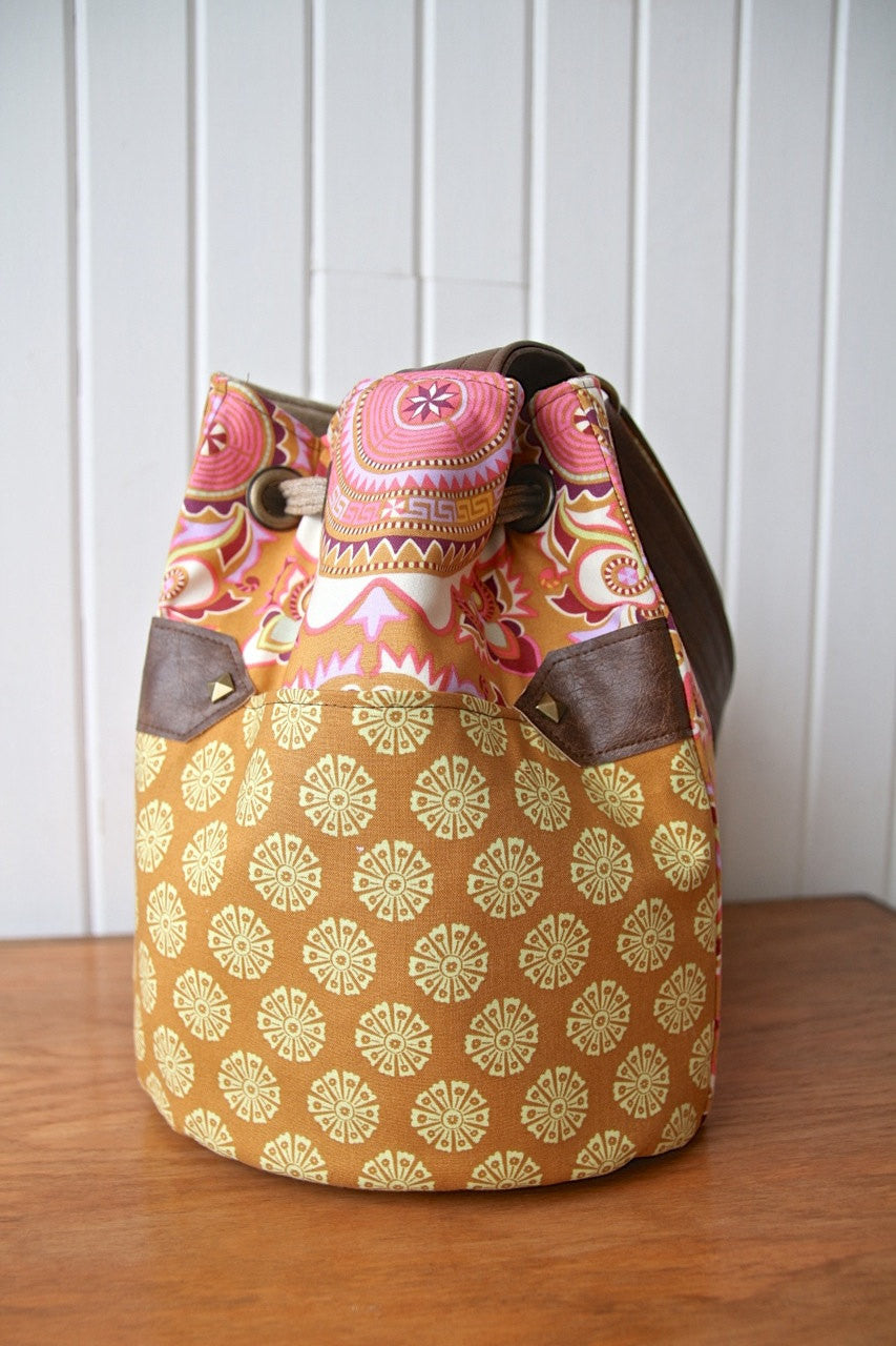 The Dahlia Drawstring Bucket bag is a trendy medium sized bag that stays closed with a drawstring closure. It has 2 exterior side pockets, 1 interior slip pocket and 1 interior zippered pocket. On the exterior, you can use quilt weight cotton or home decor fabric. There are some vinyl/faux leather accents at the side pockets, on the front of the bag, the bottom and the top side of the adjustable cross body strap.