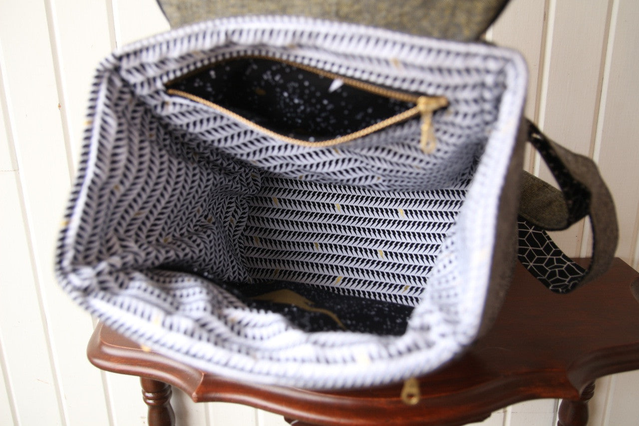 Regardless of which version you choose to make, both have 2 exterior zippered pockets under the flap. The flap has a thumb lock (or tongue lock or tuck lock) closure with a handle at the top for carrying. If you prefer a twist lock closure, I've also written a tutorial that explains the steps and modifications required. The interior of the bag has 2 slip pockets and 1 zippered pocket.